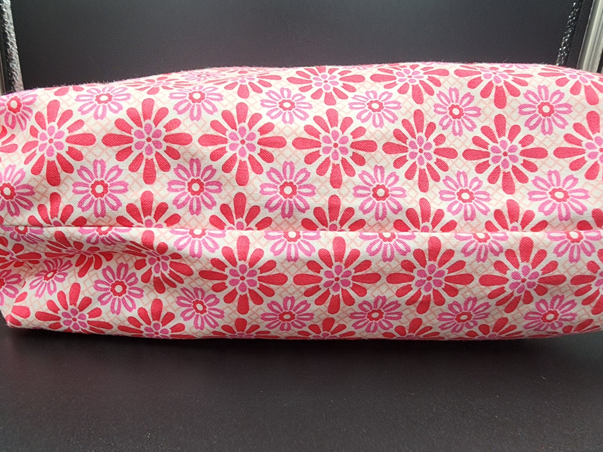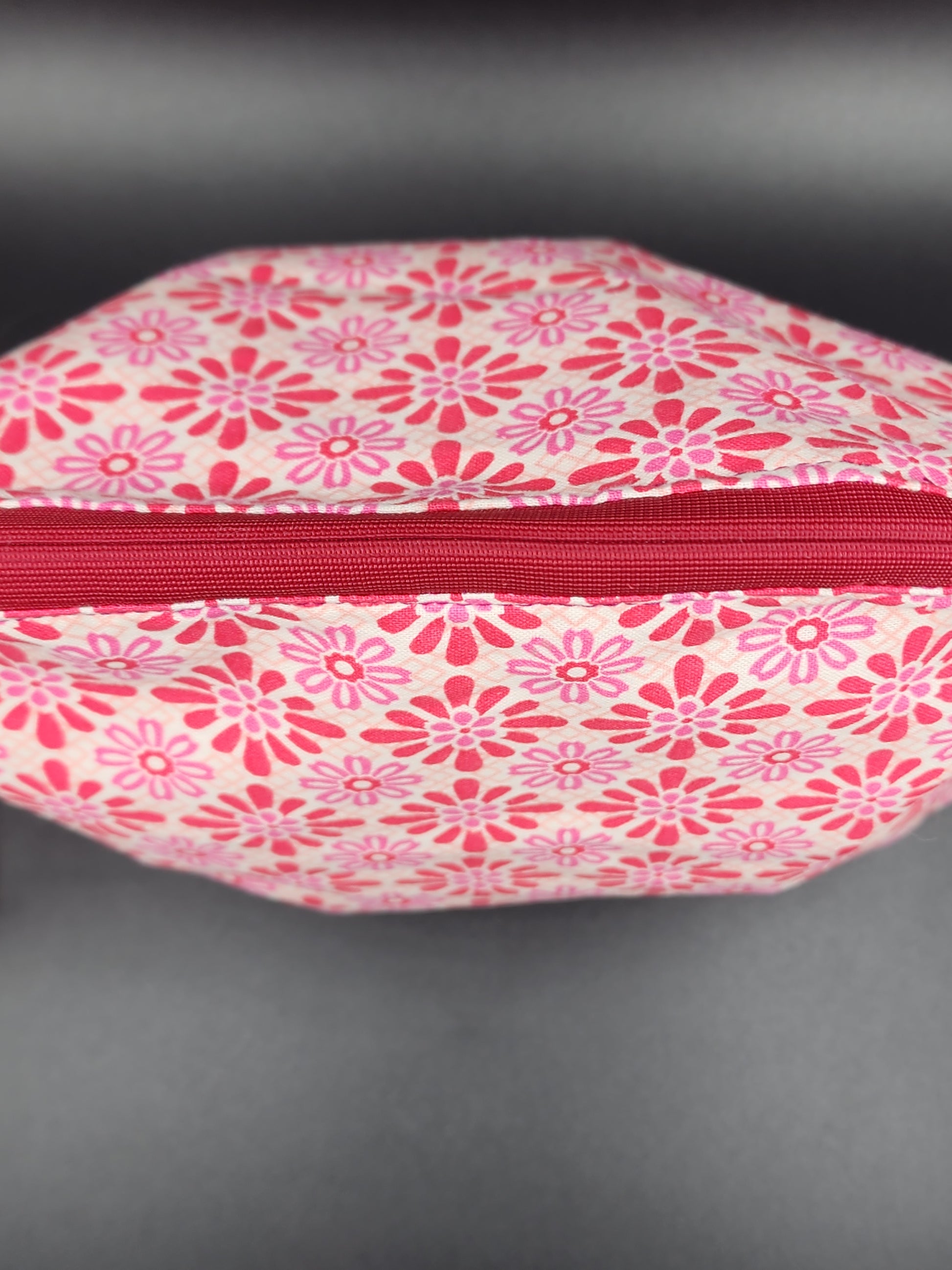 This is a fun cloth project or knicknack bag that measures 11" at the bottom and is 9" tall and has a matching cloth handle and lining. Zipper opening is 7".