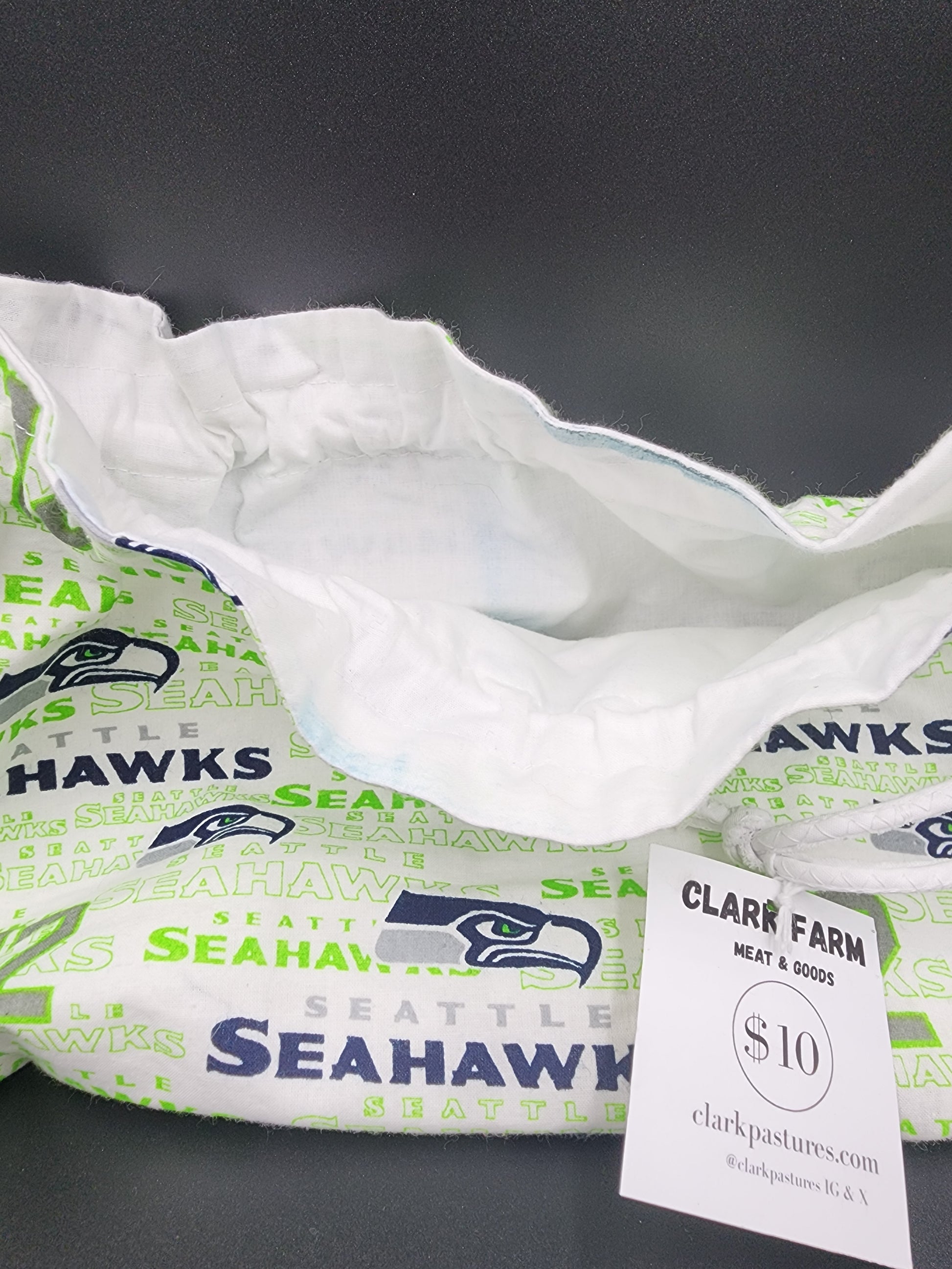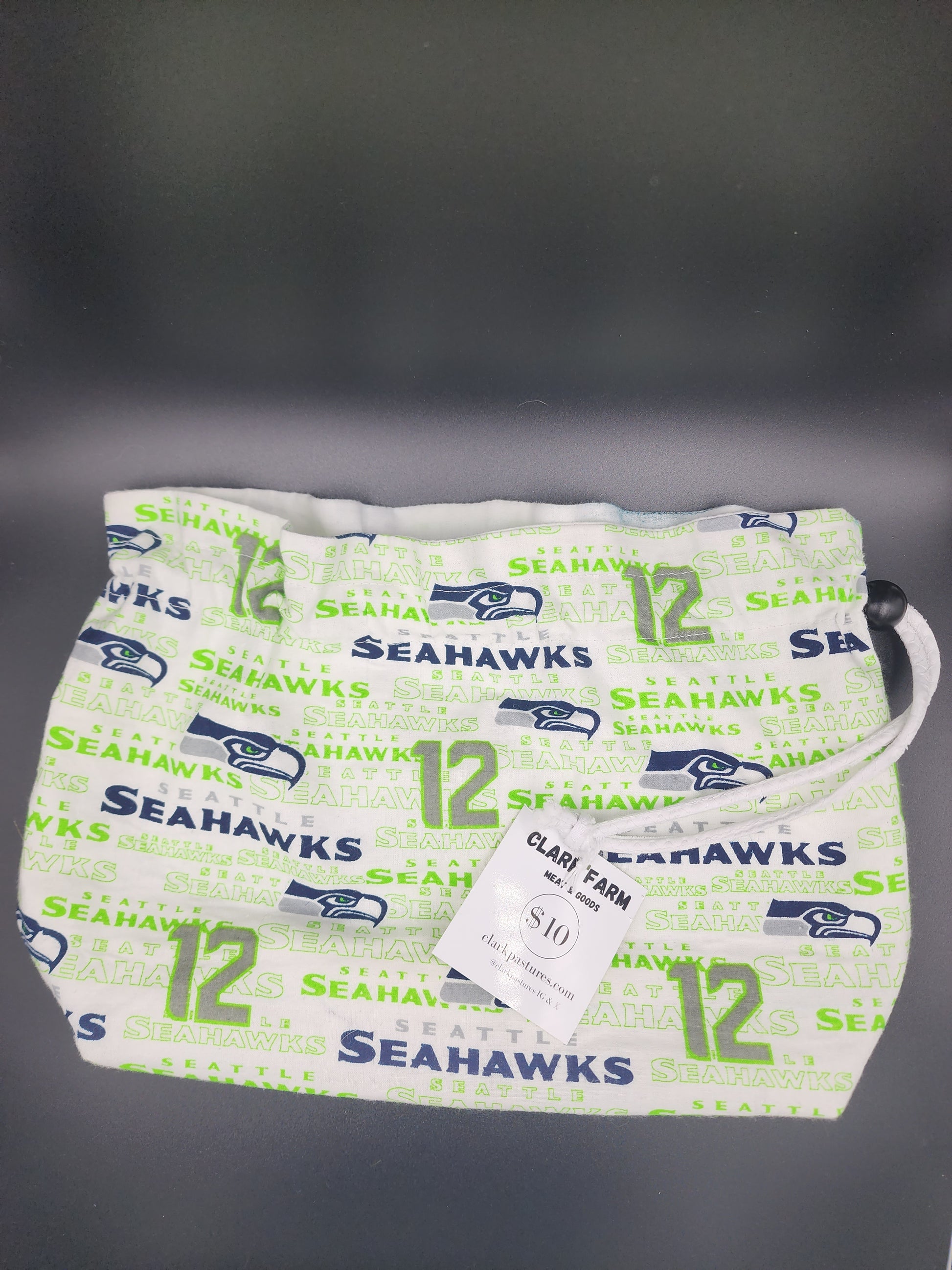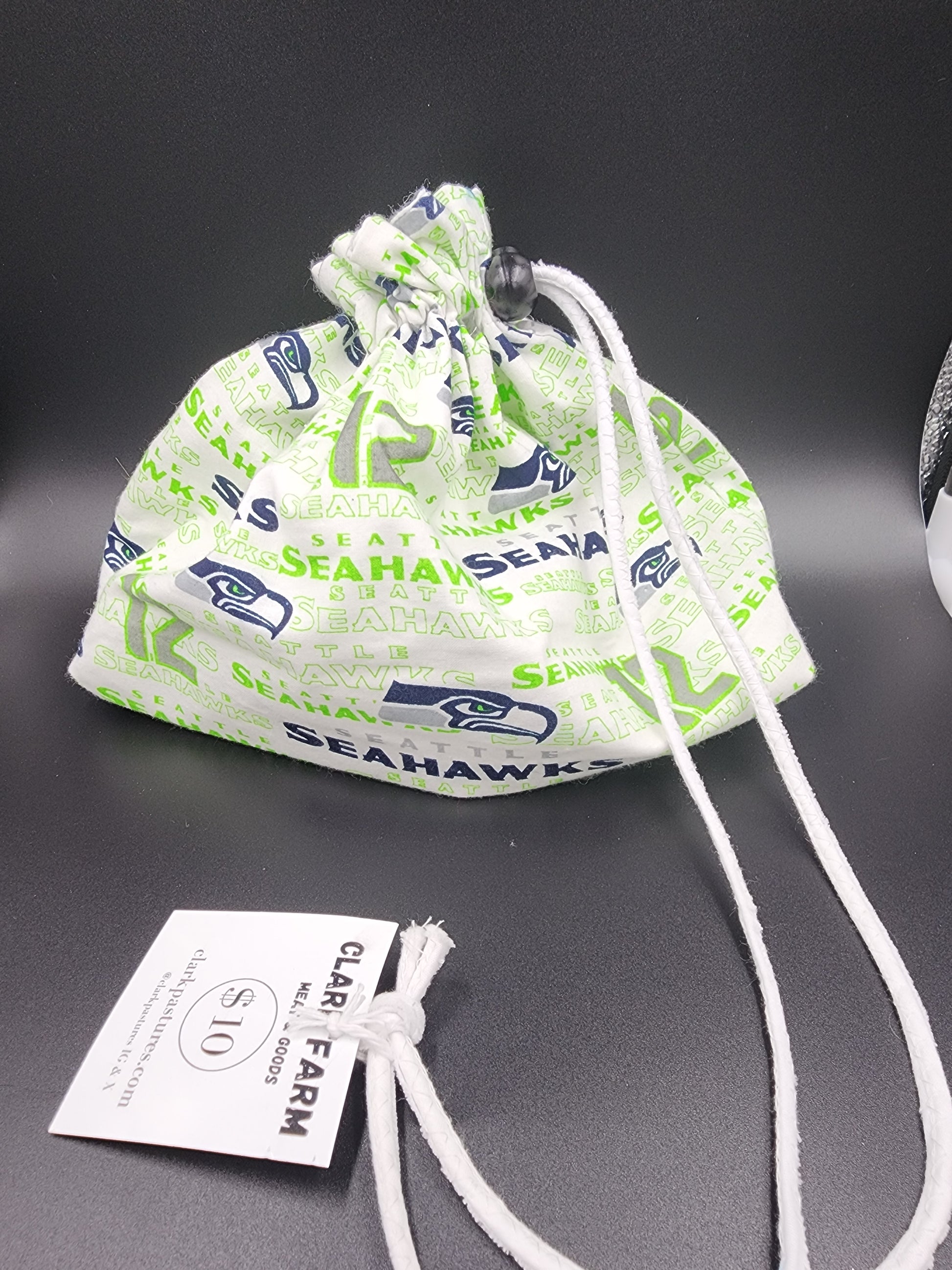 Expertly crafted for the loyal Seahawks fan, our drawstring bag is made from team-inspired fabric it has a spring slide closure makes it easy to access your items and has a white cloth lining. A must-have for any project or on-the-go game day.